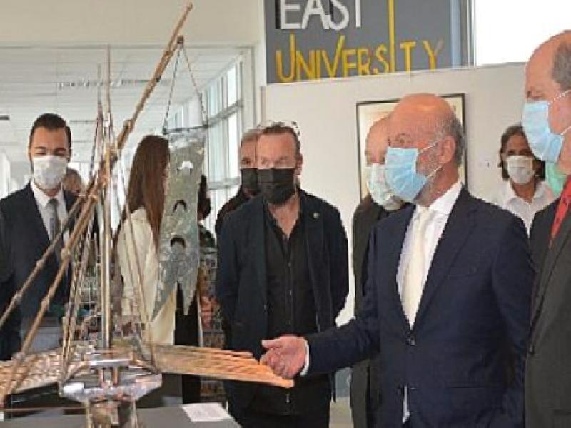 Kuzey Kıbrıs Türk Cumhuriyeti’nin 38’inci kuruluş yıl dönümü kutlamaları kapsamında, Kıbrıs Çağdaş Sanat Müzesi’nin düzenlediği, yağlı boya, baskı fotoğraf, ipek üzerine tükenmez kalem, heykel ve gemi modellerini bir ortaya getiren 5 stant, Cumhurbaşkanı Ersin Tatar tarafından Yakın Doğu Üniversitesi İrtibat Fakültesi Stant Salonunda açıldı.