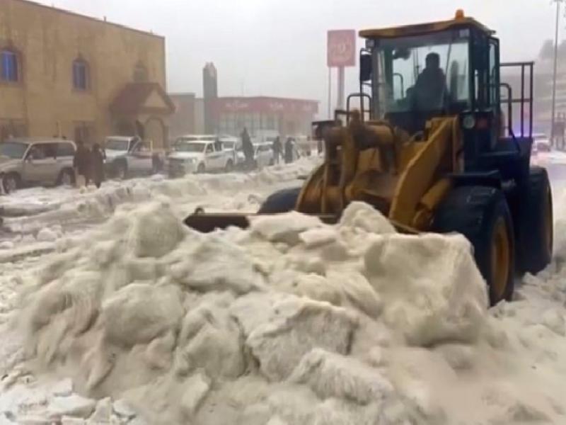 Suudi Arabistan’ın batısındaki Al-Baha şehri, Pazartesi günü bölgeyi vuran ve bazı bölgelere bir metre kadar dolu yağdıran şiddetli dolu fırtınasının ardından dönüştürüldü.