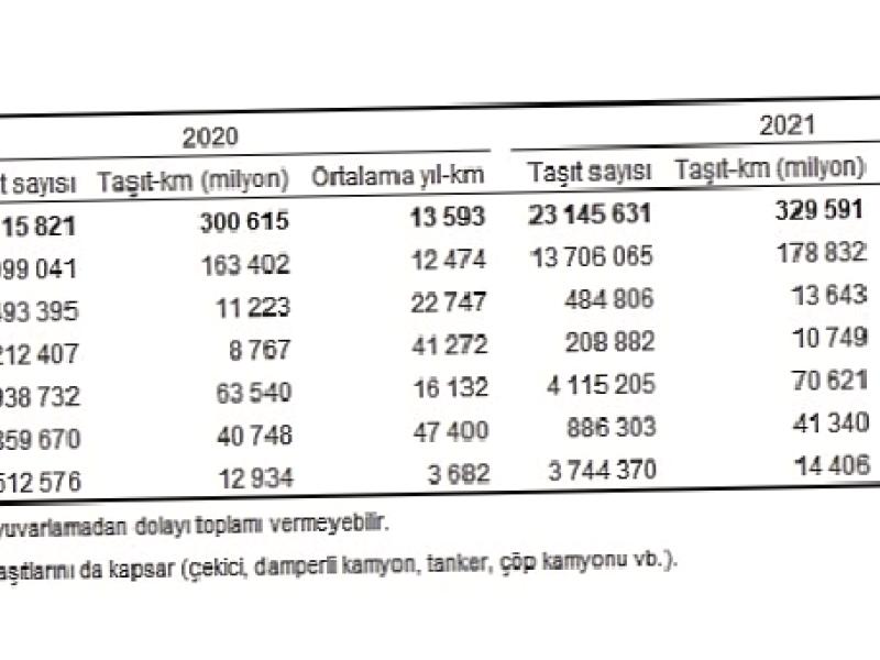 Türkiye’de 2021 yılında trafiğe kayıtlı toplam motorlu kara taşıtları sayısı bir evvelki yıla nazaran %4,7 artarken toplam taşıt-km %9,6 artış gösterdi. Taşıt sayısı; motosikletlerde %6,6, arabalarda %4,6, kamyonetlerde %4,5 ve kamyonlarda %3,1 artarken, otobüslerde %1,7 ve minibüslerde %1,7 azaldı. Taşıt-km ise otobüslerde %22,6, minibüslerde %21,6, motosikletlerde %11,4, kamyonetlerde %11,4, arabalarda %9,4 ve kamyonlarda %1,5 arttı.