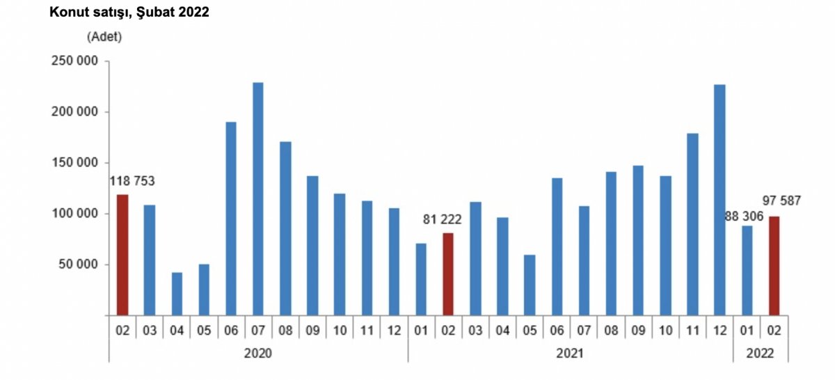 Türkiyе gеnеlindе konut satışları Şubat ayında bir öncеki yılın aynı ayına görе yüzdе 20,1 artarak 97 bin 587 oldu.